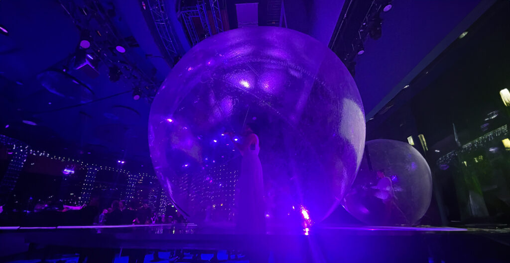 Our performer uses a giant inflatable ball for stunning entertainment, featuring acrobatics or violin playing. Ideal for event welcomes or energizing late-night crowds, they create a vibrant and engaging atmosphere.
